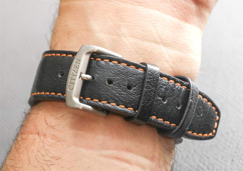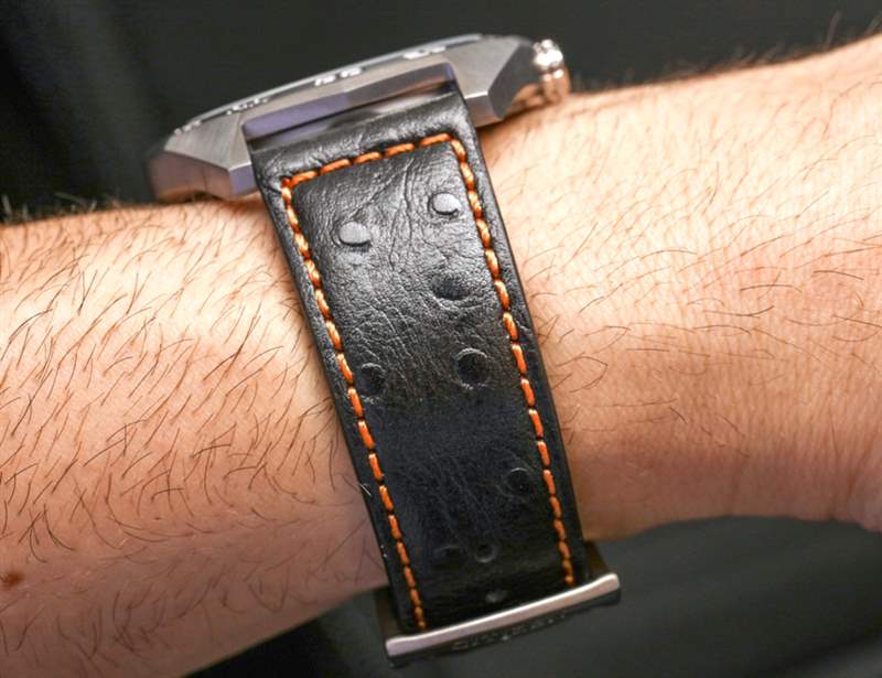 這讓我對那些和我一樣喜歡 Eco-Drive Super Titanium 的人提出了一個奇怪的建議。獲取 AW0060-03E 表盤,然后是手鐲上的其中一個型號(例如 AW0060-54A),然后將手鐲換成皮革表帶。表帶實際上很好看,但你可能知道我是手鐲的傻瓜,所以我更喜歡它。兩條皮表帶外側有鴕鳥紋,看起來還不錯,不像廉價的假鱷魚紋。在評測過的手表上,表帶是黑色的,帶有橙色縫線以匹配秒針。請注意與表殼設計主題相匹配的定制表帶扣。