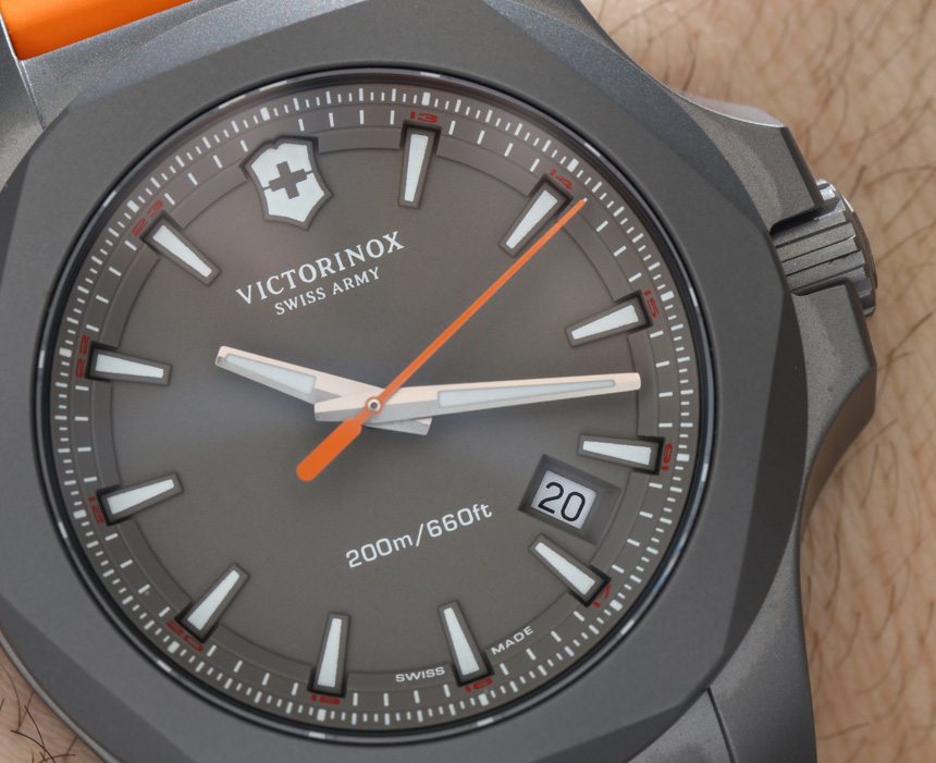 與標準 INOX 的拉絲和拋光鋼表殼不同,Victorinox Swiss Army 采用全噴砂處理鈦金屬表殼。我有一種感覺,這是 2 級和 5 級鈦金屬,這實際上很有趣,因為 INOX 式表殼的清晰角度和精確曲線做得非常好。與鋼相比,鈦的灰色外觀也在設計中得到了強調。此外,表殼的啞光處理流向表盤,為這款生活方式運動手表帶來更加清醒、工具風格的外觀。