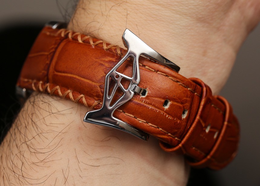 旋轉的“圓柱體”被應用到表盤上,就像將自動轉子設置在一圈滾珠軸承上一樣,而應用的子彈頭產生失重以使其旋轉。在滾珠軸承組件的中間是設置時針和分針的地方——再次使用了新的東西。在這里你有全新的和相當經典的手,這也是我不希望從 ArtyA 看到的東西。我想隨著 Arpa 的成熟,他會變得更加傳統……一個很酷的細節讓整個設計回歸到它的滾動精神是表帶扣的樣式,以及表帶上的十字交叉縫線。