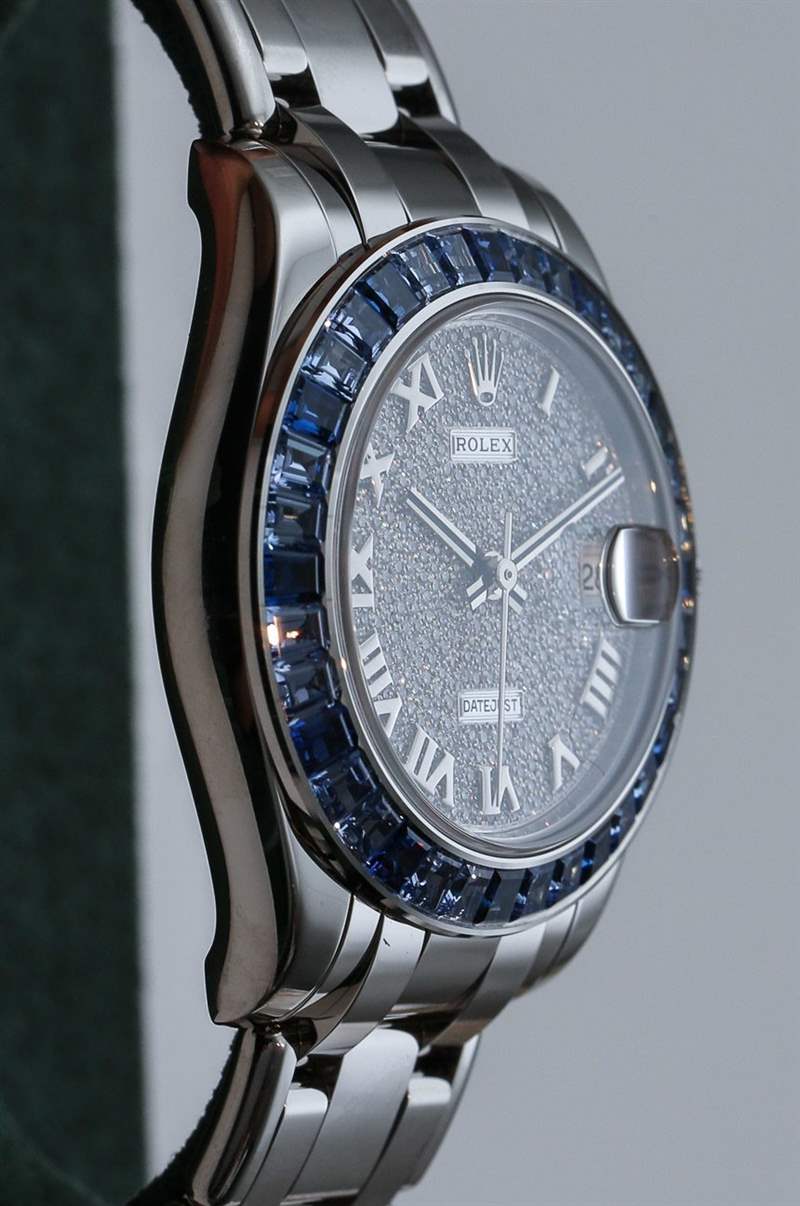作為珠寶手表,有很多值得欣賞的地方。例如,在應用小時刻度之前,表盤是手工鑲嵌鉆石的。如果您仔細觀察表圈,您會發現勞力士在每個時標點選擇顏色稍深的寶石。當然,所有寶石均由勞力士內部手工鑲嵌,品質卓越。每款 Pearlmaster 腕表均可選配鑲鉆手鏈。