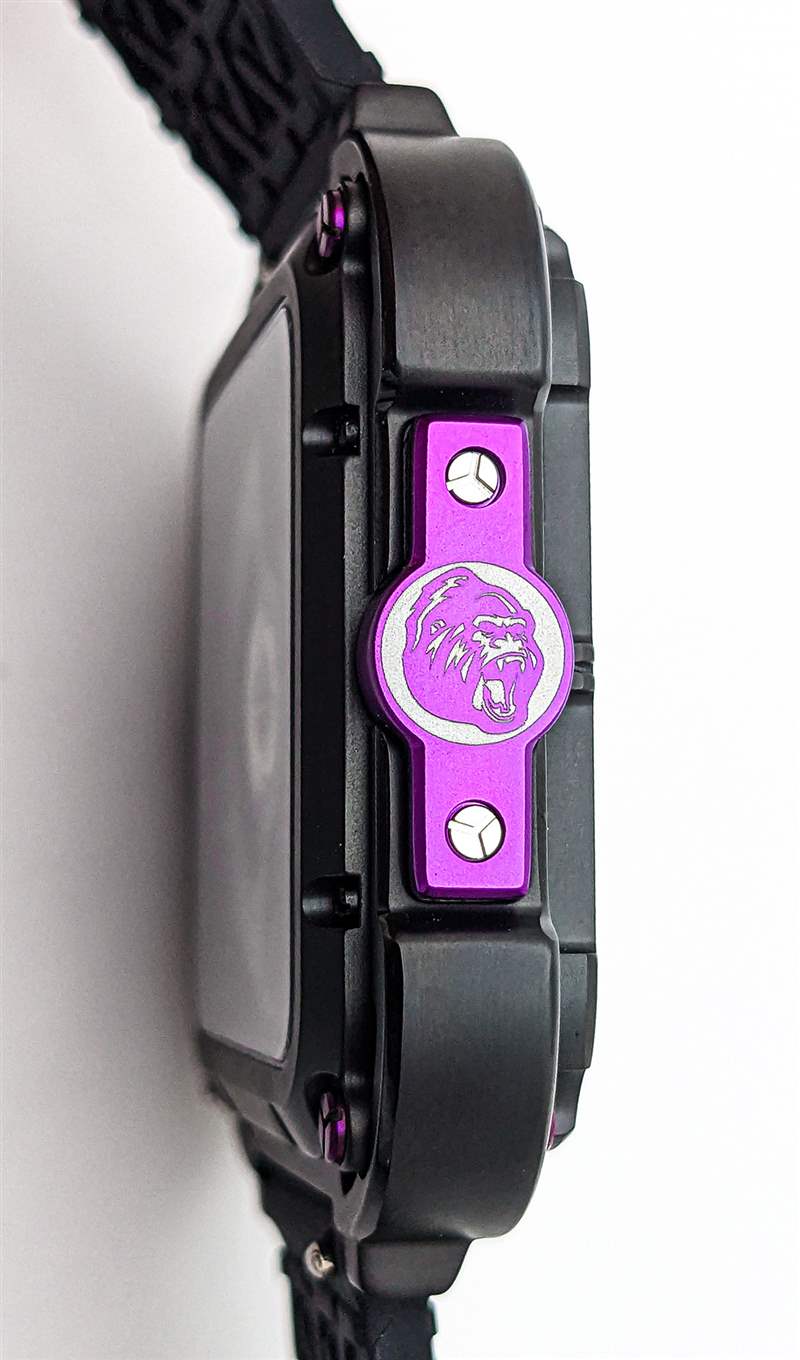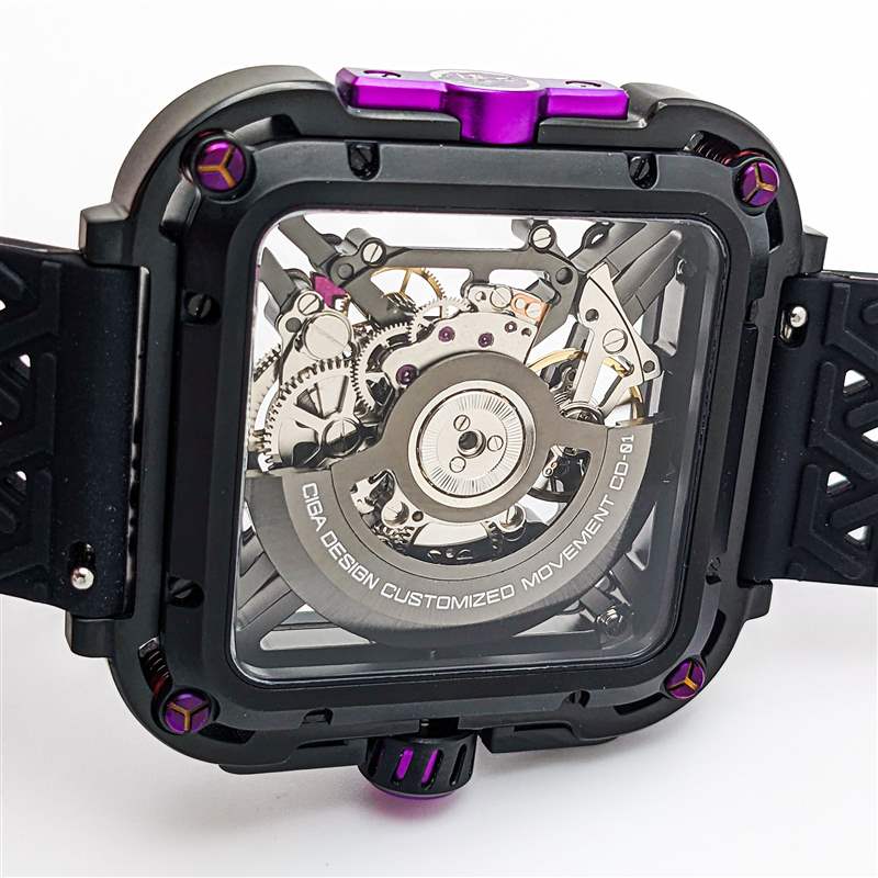 CIGA Design Series X Gorilla 采用 44 毫米寬的圓角方形鏤空表殼設(shè)計(jì),無(wú)可否認(rèn)在手腕上顯得格外重要。由 DLC 涂層不銹鋼和 2 級(jí)鈦混合制成,這與入門(mén)級(jí)手表設(shè)計(jì)一樣狂野和前衛(wèi),采用雙層表殼系統(tǒng),外殼環(huán)連接到階梯式內(nèi)表殼通過(guò)一組四個(gè)減震彈簧。CIGA Design 聲稱(chēng)這是第一個(gè)安裝在手表表殼上的抗震懸掛系統(tǒng)(盡管它與 Formex 多年來(lái)使用的表殼彈簧系統(tǒng)非常相似),并用一組醒目的紫色涂層螺絲突出這些彈簧. 橡膠表冠和表殼 9 點(diǎn)鐘方向的更多紫色點(diǎn)綴為設(shè)計(jì)增添了一些真正引人注目的亮點(diǎn),特別是與 9 點(diǎn)鐘位置的印刷大猩猩徽章搭配使用時(shí)(X 系列大猩猩的其他變體將這些紫色點(diǎn)綴換成了橙色、紅色、藍(lán)色或金色的亮點(diǎn))。雖然大部分表殼都是簡(jiǎn)單的啞光黑色,但 CIGA Design 確實(shí)在表殼邊緣和表圈上添加了細(xì)長(zhǎng)的拋光倒角,以作為手腕上有效的邊緣亮點(diǎn)。這種表圈設(shè)計(jì)也是 Series X Gorilla 唯一的一組小時(shí)和分鐘標(biāo)記,帶有尖角以指示表盤(pán)上的每五分鐘間隔。雖然這是使完整的骨架設(shè)計(jì)在紙面上更清晰易讀的巧妙解決方案,但在實(shí)踐中,這仍然會(huì)導(dǎo)致一目了然的準(zhǔn)確閱讀出現(xiàn)一些困難,尤其是方形表殼的形狀。廣告留言廣告信息結(jié)束