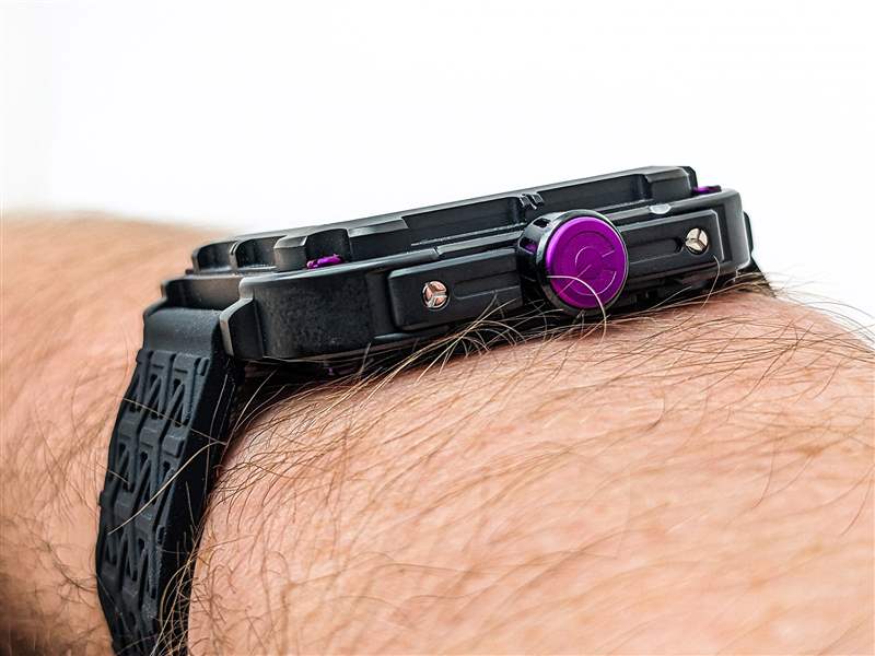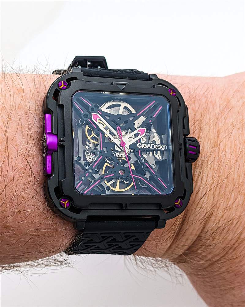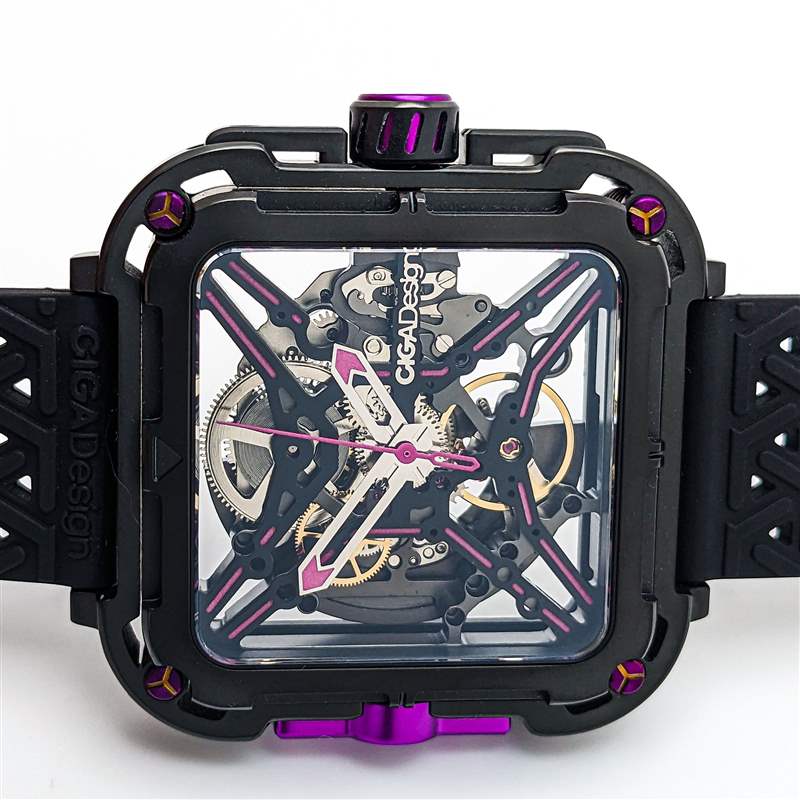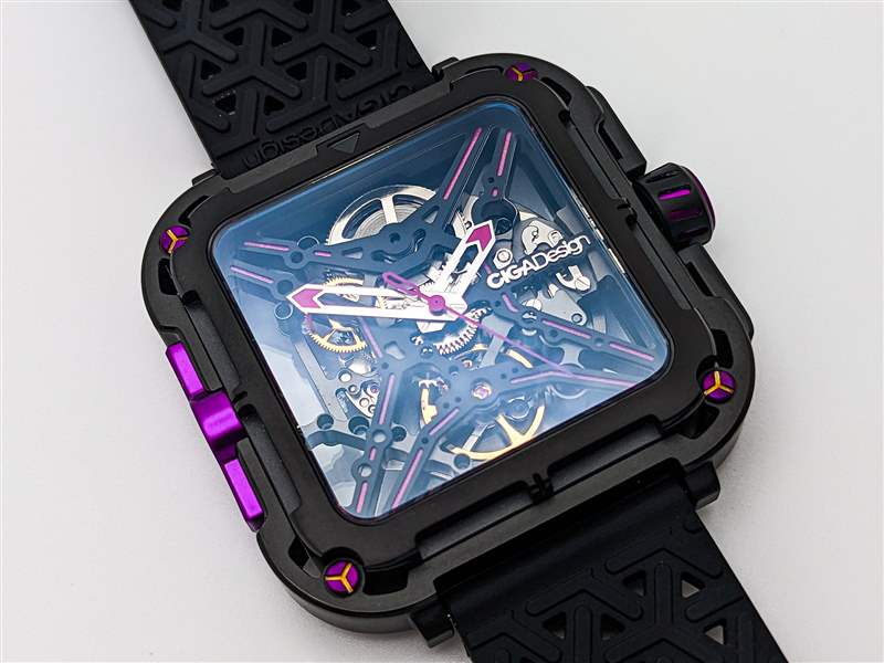 以入門(mén)級(jí)價(jià)格找到真正定制的全鏤空表盤(pán)并不常見(jiàn),但 CIGA Design Series X Gorilla 在這里提供動(dòng)態(tài)高端外觀(guān)。Series X 命名法來(lái)自中央 X 形鏤空表盤(pán),它也可用作華麗的機(jī)芯橋板。CIGA Design 在此延續(xù)紫色主題,在鏤空腕表的手臂上涂上紫色 Super-LumiNova 夜光細(xì)條,并在拋光鏤空直劍形指針和中央棒形秒針上點(diǎn)綴紫色點(diǎn)綴。紫色在現(xiàn)代制表業(yè)中是一種罕見(jiàn)的顏色,與 Series X Gorilla 的前衛(wèi)風(fēng)格相結(jié)合,在這個(gè)細(xì)分市場(chǎng)中打造出真正獨(dú)一無(wú)二的外觀(guān)。然而,值得注意的是,這種 lume 應(yīng)用較弱,只能在短時(shí)間內(nèi)發(fā)出暗淡的綠色光。鑒于這個(gè)價(jià)位的其他品牌,尤其是 Seiko,能夠提供出色的 lume 工作,這是一個(gè)潛在的缺點(diǎn),值得注意。與此相關(guān)的是,與大多數(shù)骨架設(shè)計(jì)一樣,X 系列大猩猩乍一看可能難以閱讀,但拋光手機(jī)與黑色骨架表盤(pán)形成鮮明對(duì)比確實(shí)在一定程度上緩解了這個(gè)問(wèn)題。