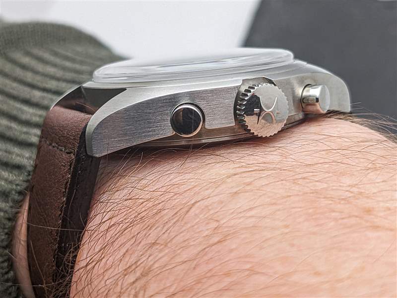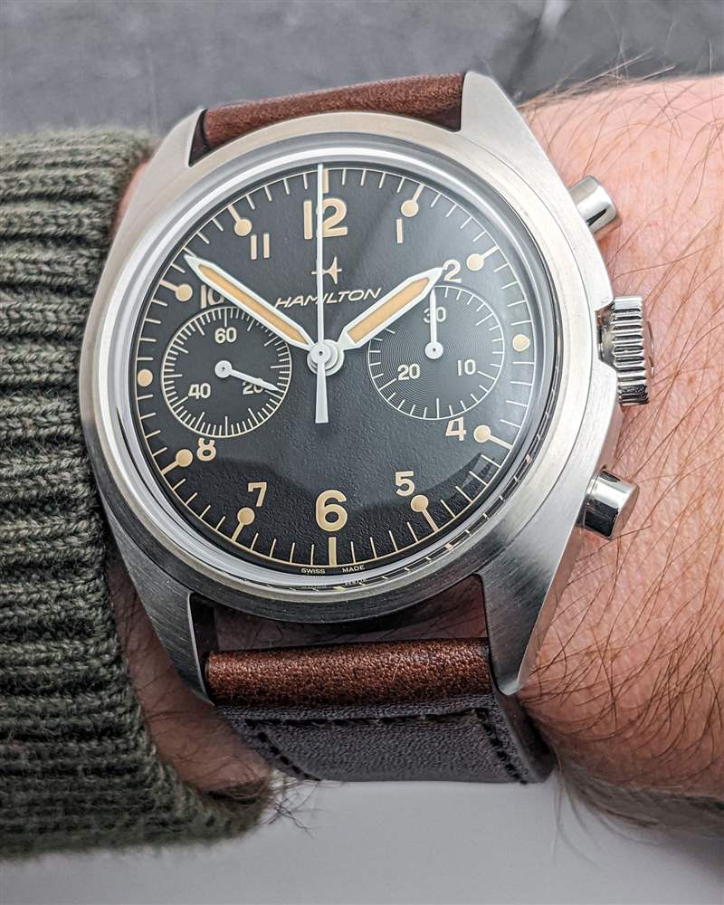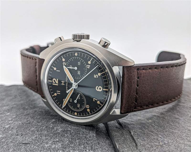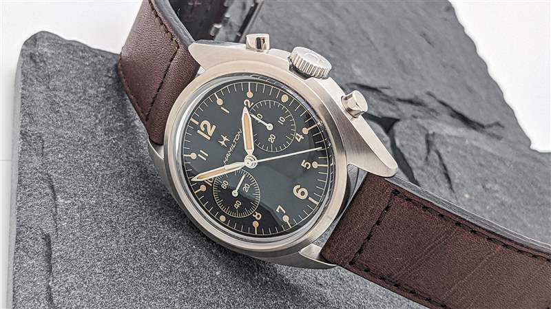 漢米爾頓為 Khaki Pilot Pioneer 機(jī)械計(jì)時(shí)碼表搭載 H-51-Si 手動上鏈計(jì)時(shí)機(jī)芯。H-51-Si 是可追溯至 Valjoux 7753 的血統(tǒng)中的最新發(fā)展,但盡管基本平臺年代久遠(yuǎn),但這是一款堅(jiān)固的現(xiàn)代動力裝置。除了高端硅游絲外,H-51-Si 還提供強(qiáng)勁的 60 小時(shí)動力儲存,振頻為 28,800 bph。H-51-Si 計(jì)時(shí)碼表的按鈕動作出奇地輕巧,但足夠靈敏,可以在操作過程中提供令人愉悅的觸覺反饋。該機(jī)芯的準(zhǔn)確性也很可靠,在我們的審查期間平均每天 +5 秒。