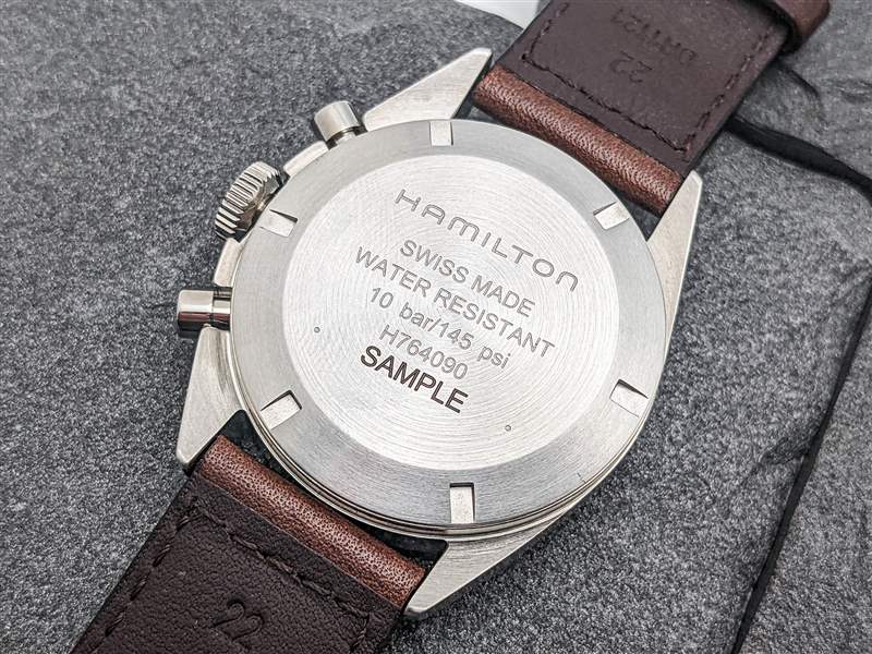 從表面上看,Hamilton Khaki Pilot Pioneer 機(jī)械計(jì)時(shí)碼表的 40 毫米寬不銹鋼表殼看起來干凈、簡單、緊湊。然而,在實(shí)踐中,這種實(shí)用的表殼設(shè)計(jì)既提供了大膽的佩戴方式,也提供了手腕上令人驚訝的細(xì)微差別。本案的視覺核心是不對稱布局。9 點(diǎn)鐘位置的表殼側(cè)面緊密包裹,直接融入平坦光滑的表圈,而 3 點(diǎn)鐘位置的表殼向外彎曲約 2 毫米。與它的 70 年代前身一樣,這是為了保護(hù)表冠和簡單的圓柱形按鈕,但不同尋常的設(shè)計(jì)賦予卡其飛行員先鋒機(jī)械計(jì)時(shí)碼表強(qiáng)健而實(shí)用的外觀。這種對干凈、直接功能的強(qiáng)調(diào)延伸到全拉絲飾面,只有帶有簽名的表冠和按鈕作為拋光亮點(diǎn)脫穎而出。然而,這種簡單性是手腕上的一把雙刃劍。與原版英國皇家空軍 (RAF) 發(fā)行的 6BB 計(jì)時(shí)碼表一樣,表殼完全采用平面設(shè)計(jì),沒有任何倒角或細(xì)節(jié),而盒裝藍(lán)寶石水晶鏡面進(jìn)一步提升了這些平面的垂直度。在手腕上,這導(dǎo)致 Khaki Pilot Pioneer Mechanical Chronograph 感覺比其 14.35 毫米厚的尺寸可能暗示的還要厚,但這不一定是壞事。這當(dāng)然是一款很難藏在袖口下的手表,但其毫不掩飾的厚度有助于賦予手表整體堅(jiān)固的感覺。為保持其軍事傳統(tǒng),Hamilton 使這款腕表的堅(jiān)固底蓋極為簡潔。這里唯一要說的版畫是四行基本的文字,廣告留言廣告信息結(jié)束
