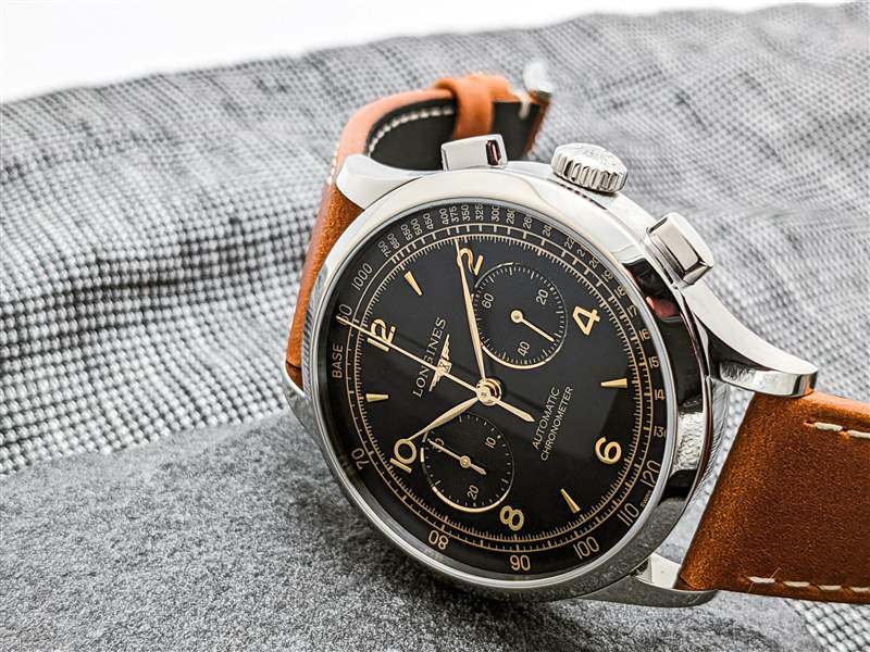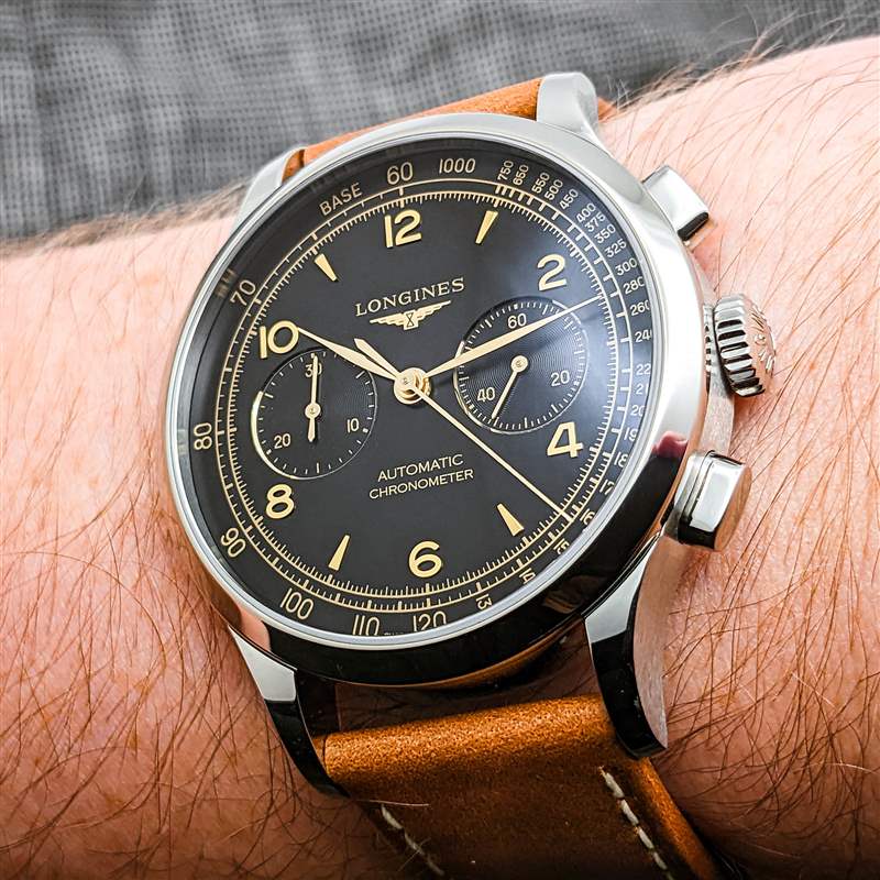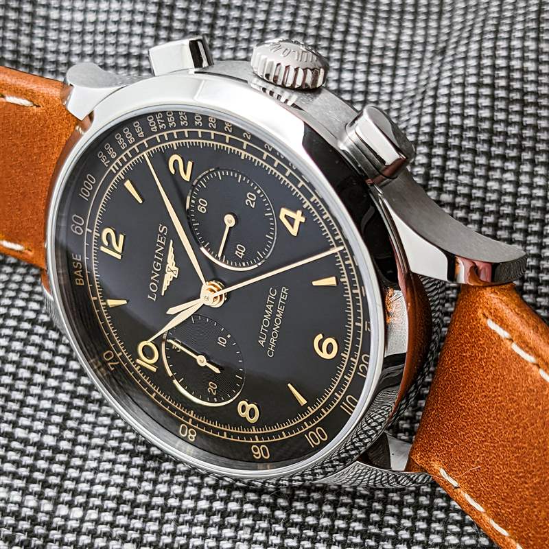 與安靜成長的 30 年代/40 年代計時碼表領域中的大多數競爭對手相比,浪琴表 Record Heritage 提供了非常干凈和內斂的表盤設計。浪琴 (Longines) 對復古風格的啞光黑色表盤并不陌生,Record Heritage 表盤光滑、均勻的飾面賦予其干凈、經典的外觀,而不會給人以古銅色的印象。話雖如此,由于其小表盤刻度、徽標以及測速計刻度和計時碼表秒軌道的雙外圈的鍍金表盤文字,表盤仍然提供了充足的視覺溫暖。在保持 40 年代的設計感及其迷人的視覺復雜性的同時,這些外部刻度還將表盤設計的其余部分壓縮到更小的區域,進一步增強手腕上的緊湊感。然而,真正吸引眼球的是金色表盤硬件。實用的阿拉伯數字和楔形索引的組合明亮而迷人的老式風格,優雅纖薄的葉子手機也是如此。雙凹陷子表盤周圍的金色裝飾環讓 Record Heritage 在手腕上看起來更加閃亮,同時自然地將眼睛吸引到那里的關鍵信息。Longines 選擇用 azurage 完成這些子表盤,讓大部分啞光設計在不斷變化的光線下也有一點活力。盡管整體布局優雅、精致且視覺平衡令人印象深刻,但 Record Heritage 的易讀性可能是愛好者爭論的焦點。精美印刷的計時秒針刻度,葉子聽筒的纖細尖端,