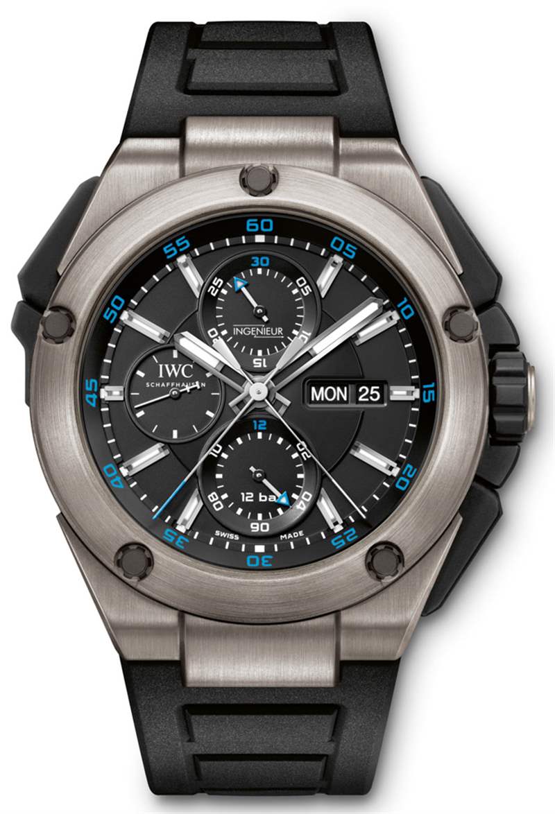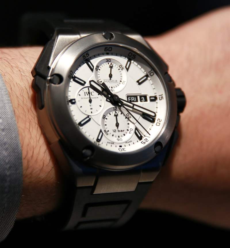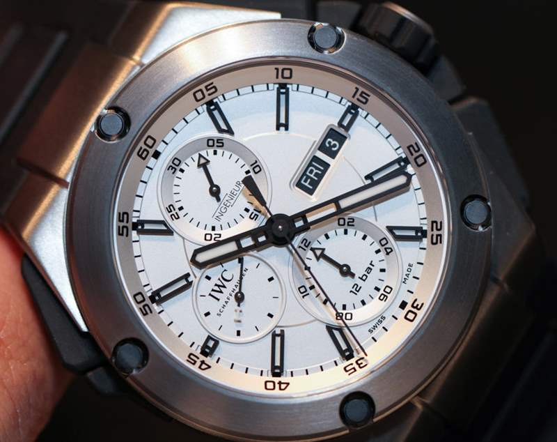 IWC 萬國表為 Ingenieur Double Chronograph Titanium 提供兩種表盤顏色。一個(gè)是黑色和藍(lán)色調(diào),但我們一直被“鍍銀”色調(diào)的表盤所吸引。雖然不完全是白色,但它幾乎是白色的運(yùn)動(dòng)手表表盤——我們喜歡它們。在我們對(duì) Porsche Design Flat Six P’6310 手表的評(píng)測(cè)中,我們討論了生產(chǎn)輕型表盤運(yùn)動(dòng)手表的困難,以及如何取得成功。關(guān)鍵是正確的黑色材料和缺乏反射率。粗輪廓的黑色指針和應(yīng)用的小時(shí)指示器很好地執(zhí)行了這一點(diǎn)。雖然表盤帶有一絲光澤,但工程師雙人計(jì)時(shí)碼表鈦金屬表盤上的所有指示器都以美麗的樂器風(fēng)格脫穎而出。