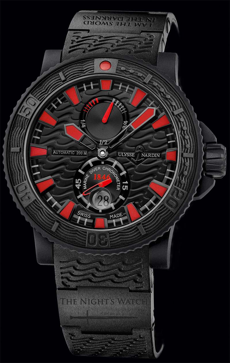 雅典表 Marine Diver Black Sea 限量發(fā)行 25 枚,具有一些《權(quán)力的游戲》和《守夜人》的特色。大多數(shù)情況下,它是該品牌廣受歡迎的 Marine Diver 的紅色調(diào)版本,此處僅針對《權(quán)力的游戲》和 HBO 稍作修改。您可以在此處查看 aBlogtoWatch手表計時版的實際操作。45.8 毫米寬的表殼采用精鋼制成,并涂有硫化黑色橡膠。橡膠還覆蓋了旋轉(zhuǎn)潛水員的表圈。