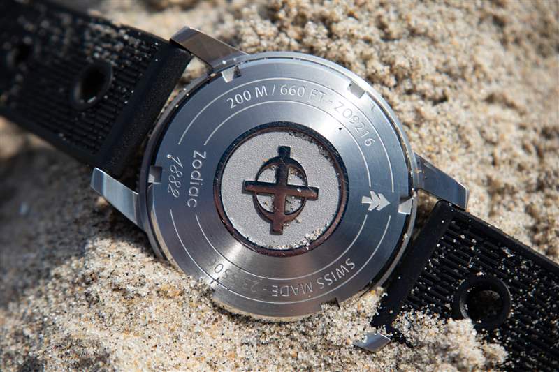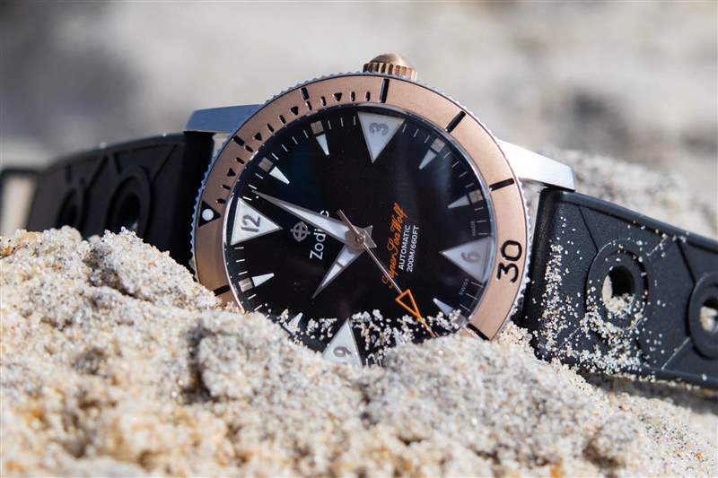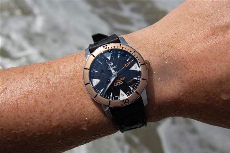 當然,我從來沒有擔(dān)心過手表在海洋或我們租的房子的游泳池中的安全性(盡管你不會想知道,我五歲的孩子更喜歡游泳池,而他更年輕但更大膽的弟弟很快就熱情起來了)并首選海洋)。該腕表配備與表圈相匹配的青銅旋入式表冠,帶有 Zodiac 標志,以及纖薄但易于抓握的脊狀部分,有助于提供 200m 的防水性能。此外,雖然我沒有用麂皮表帶冒險進水,但將橡膠表帶牢固地固定到位的扭結(jié)帶扣讓我感到很安慰。