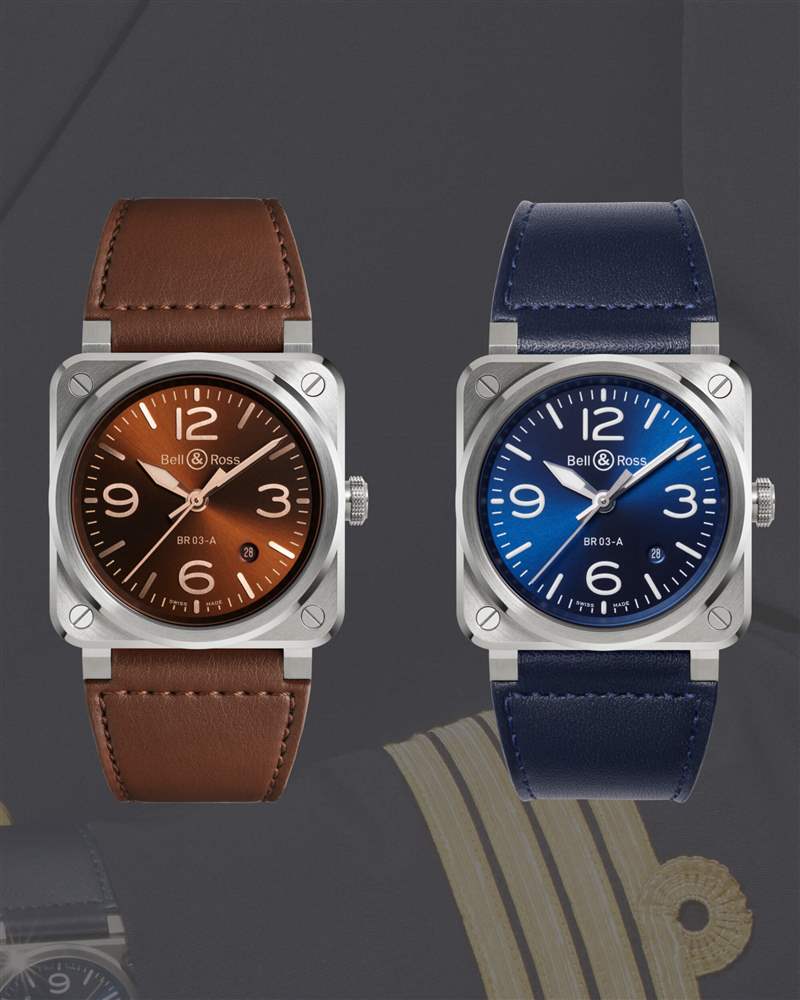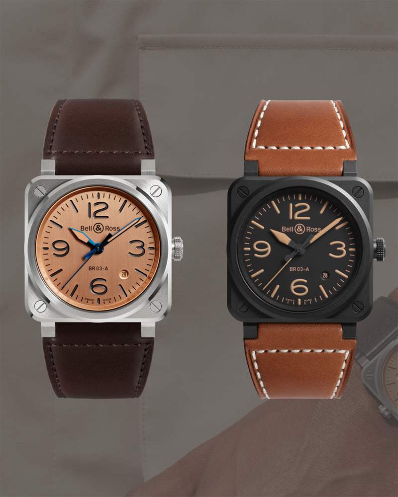 新表款中有許多熟悉的面孔:帶有白色標記的黑色表盤、該品牌美麗的旭日藍,以及一些不太為人所知的表盤,例如全黑幻影、玫瑰金棕配色的Golden?Heritage?,以及黑底棕褐色的 Heritage。但該品牌利用這個機會推出了 BR 03 系列的兩款新型號。第一個是黑色陶瓷表殼中非常有策略性的橄欖色表盤,該品牌將其稱為“軍事”。它有黑色標記和指針,以及與表盤協調的橡膠表帶;這一張在渲染圖和新聞照片中是綠色的,但在親自觀看時可以看到淡黃色的色調。另一種新款式是銅色,其特點是垂直拉絲表盤和拋光藍色聽筒。